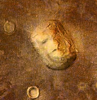 But I wanna—since we’re on the planet Mars, I wanna share some things with you that you might find interesting and maybe this is old news for you. This is a blow up of something that occurred on, uh, Viking 1, orbit number 35. It encountered on a large, flat plain—this peculiar structure. It’s called, ‘the face on Mars’. It’s a structure that’s about a mile across. It’s a structure that is possibly, many people argue, is just a strange aberration by just the accident of meteor hits or whatever. But more and more people who have studied it are bothered by that—for, cause it has some strange features….