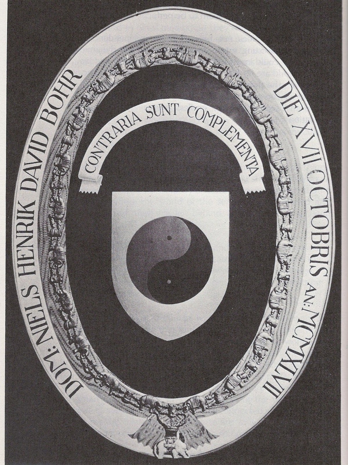 Niels Borh was well aware of the parallel between his concept of complementarity and Chinese thought. When he visited China in 1937, at a time when his interpretation of quantum theory had already been fully elaborated, he was deeply impressed by the ancient Chinese notion of polar opposites, and from that time he maintained an interest in Eastern culture. Ten years later, Bohr was knighted as an acknowledgement of his outstanding achievements in science and important contributions to Danish cultural life; and when he had to choose a suitable motif for his coat-of-arms his choice fell on the Chinese symbol of t’ai-chi representing the complementary relationship of the archetypal opposites yin and yang. In choosing this symbol for his coat-of-arms together with the inscription Contraria sunt complementa (opposites are complementary), Niels Bohr acknowledged the profound harmony between ancient Eastern wisdom and modern Western science.[77]