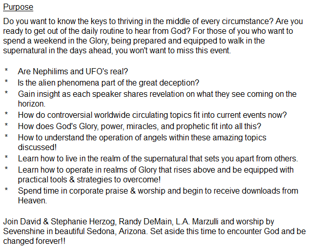 | Example of a New Apostolic Reformation conference in Sedona advertised on TheElijahList, 6/13/13 |
