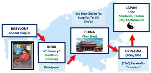 In order for one to “withdraw his/her senses from the world” and “to yoke” with the Hindu god, the practitioner has to master certain meditative poses (postures, positions) and thus awaken the sleeping serpent at the base of the spine through meditation, unleashing the kundalini or Ki Force. As mentioned in Part 1, these meditative Hindu practices were the very teachings that the forefather of Yoga and the Martial Arts carried with him from India to China, and hence to the rest of the world (see map at top of this post):