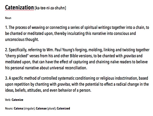 Paul Young’s A Catena exhibits thirty-four Scripture passages to support and promote among Christians his belief in universal salvation, especially those persons who reside within the spectrum of pan-evangelicalism. “I have listed a chain of scriptures, a catena, that relate directly to this conversation.” (LWBAG, 119) Note: Young calls his “chain of scriptures” (plural) A Catena when more accurately it should be titled A Catenae (Lat. plural.). If Young is intentionally using the collective singular (Catena) , then it must be concluded that the singular verses in his A Catena are to be chanted or meditated upon together as a collective unit, in one long chain; i.e., a narrative. In other words, it is a package deal. In order to describe this process, I have coined the word Catenization: