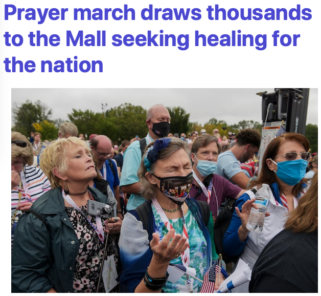 Concurrently, across the Washington Mall Franklin Graham, esteemed son of the late Billy Graham, also held a prayer revival event. He likewise proclaimed that America is a Christian nation.[2] He stood amidst an ecumenical hodgepodge of prominent leaders, some of whom also attended Cahn’s event. On his Facebook page afterwards (9/27/20) Graham thanked these leaders: