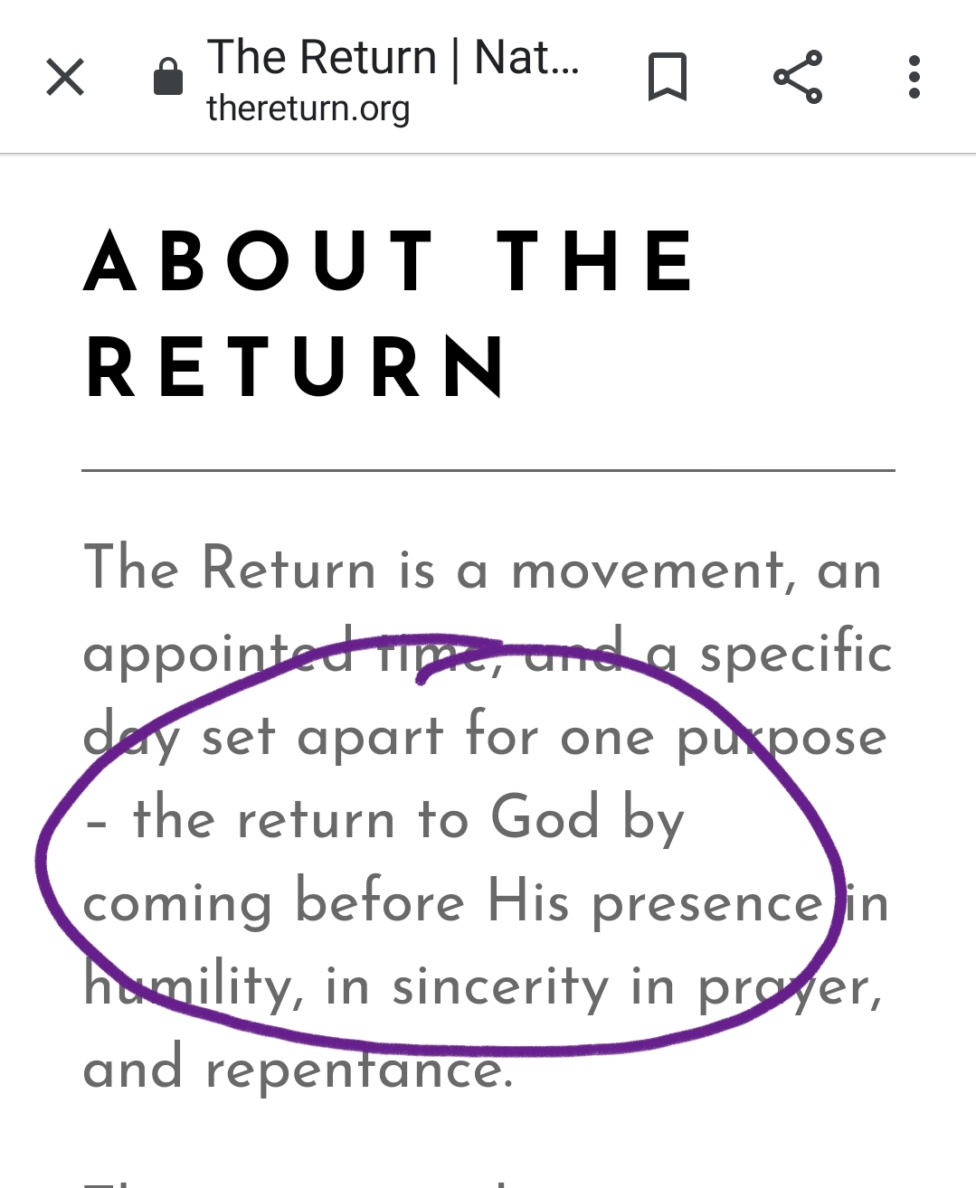 The question needs to be asked – what is meant by “The Return”? Since we do not have an early review copy of Cahn’s book we can surmise that “return” means “repentance,” i.e., turning back to God because this is what he said in his remarks at 11 AM at his rally. And many in attendance at both Washington D.C. events seemed to sincerely desire to return to the Lord and repent.